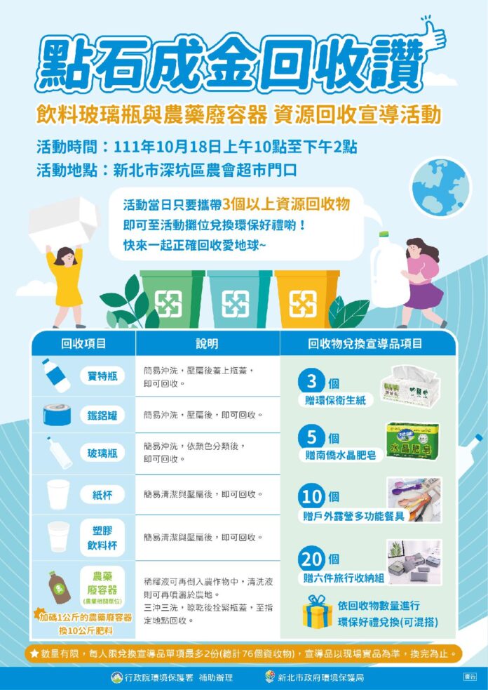 為傳達正確的農藥廢容器回收觀念,新北市環保局將於明(18)日上午10時至下午14時於深坑區農會超市門口辦理「點石成金回收讚 資源回收宣導活動」,只要攜帶3個以上資源回收物到活動現場,即可限量兌換各種環保生活好物,並加碼以1公斤的廢農藥容器兌換10公斤肥料,數量有限換完為止。