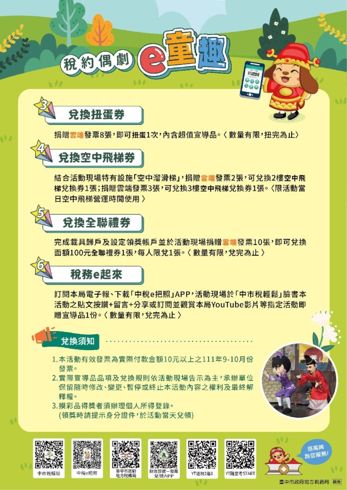 台中市政府地方稅務局大智分局為鼓勵民眾消費使用載具儲存雲端發票,將於10月22日下午3時至6時,在大魯閣新時代購物中心1樓中庭廣場舉辦「稅約偶劇‧e童趣」租稅宣導活動,活動當日將邀請小青蛙劇團演出「賣香屁偶劇」,免費入場,歡迎民眾大手拉小手來欣賞,響應社會公益,吸收稅務知識。
