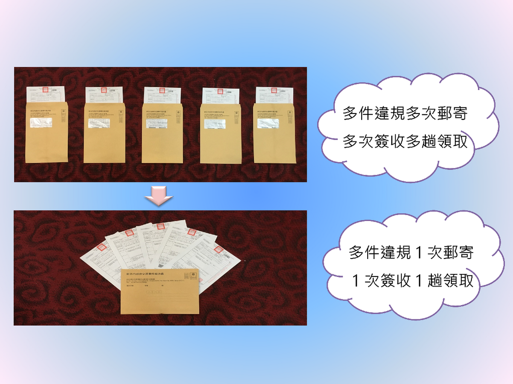裁決處統計,每月透過總歸戶平均寄送約3萬件裁決書,以每件掛號附回執郵資為43元計算,原採單件寄送郵資就須花費129萬元;現行將同一違規人多件違規案件一次寄送,每月僅須花費約10萬元郵資,大大地節省公帑支出,提升整體行政效率,且民眾不用來回奔波至郵局領取掛號信件,僅1次領取,省時又便利。