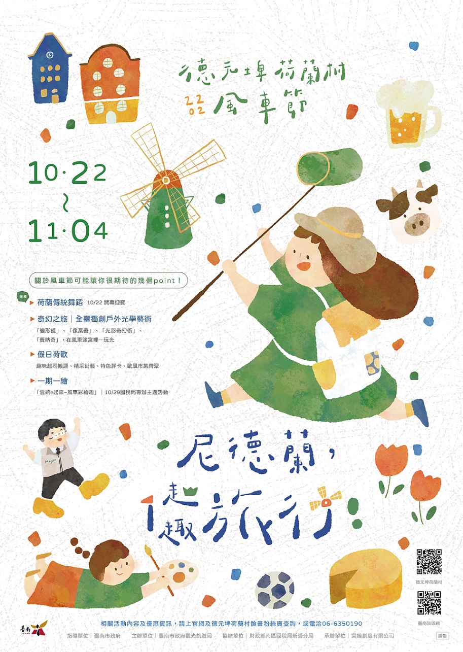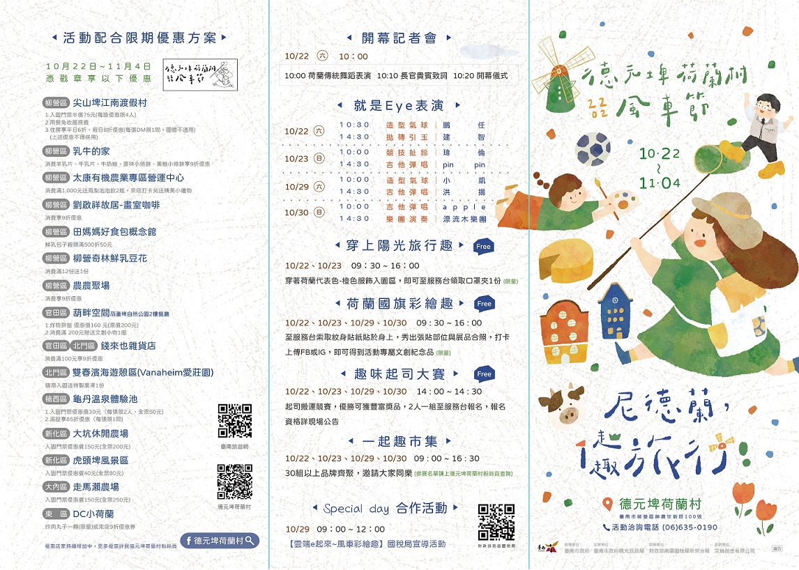 臺南市政府觀光旅遊局說明,活動舉辦地點德元埤荷蘭村為極具荷蘭異國風貌之特色風景區,除原裝進口的荷蘭大風車話題吸睛,該區酪農產業風貌也與荷蘭產業特色相符,搭配活動主題「尼德蘭,一起趣旅行」,充滿荷蘭異域風格的裝置藝術及小風車佈置品,自踏入園區的那一刻,即可讓人充分感受到荷蘭異國氛圍,安撫遊客沉寂已久未能出遊的心情;加上今年園區甫於10月中旬由特活綠小舖股份有限公司進駐營運,進入全區委外的新里程,相信會為整個園區帶來不同的新氣象!