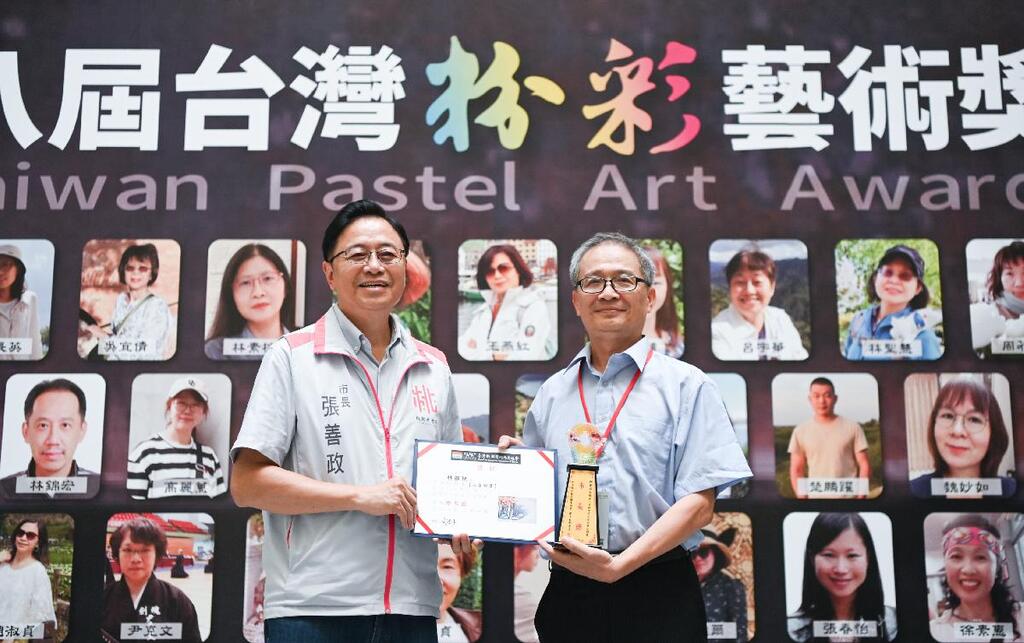 桃園市長張善政今(24)日下午前往文化局,出席「第八屆台灣粉彩藝術公開賽作品展頒獎典禮」。張市長表示,「台灣粉彩藝術推廣協會」舉辦粉彩藝術競賽,募集國內外優秀粉彩作品,8年來首次移師桃園,10月8日前均可至市府文化局2至3樓畫廊,欣賞73件精彩的競賽作品。張市長也說,粉彩畫的表現技法彈性多元,可創作出類似油彩或水彩效果,都能在本次展覽中一飽眼福,邀請市民朋友及藝術創作愛好者,踴躍前來欣賞不同畫風、令人驚艷的粉彩作品,共同推廣粉彩藝術。