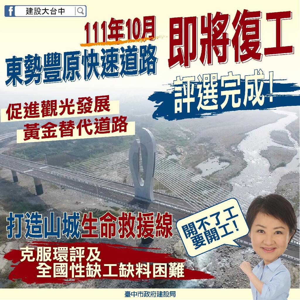 台中市長盧秀燕以溫柔堅實守護台中,面對全國性工程缺工缺料及物價攀升,造成廠商卻步投標問題,在盧市長守護山城居民的信念,及市府持續不斷努力與邀標下,東勢豐原生活圈快速道路今(18)日已評選出優質工程團隊,後續將於完備程序後進場施工,山城生命救援線宣告10月底前即將復工!