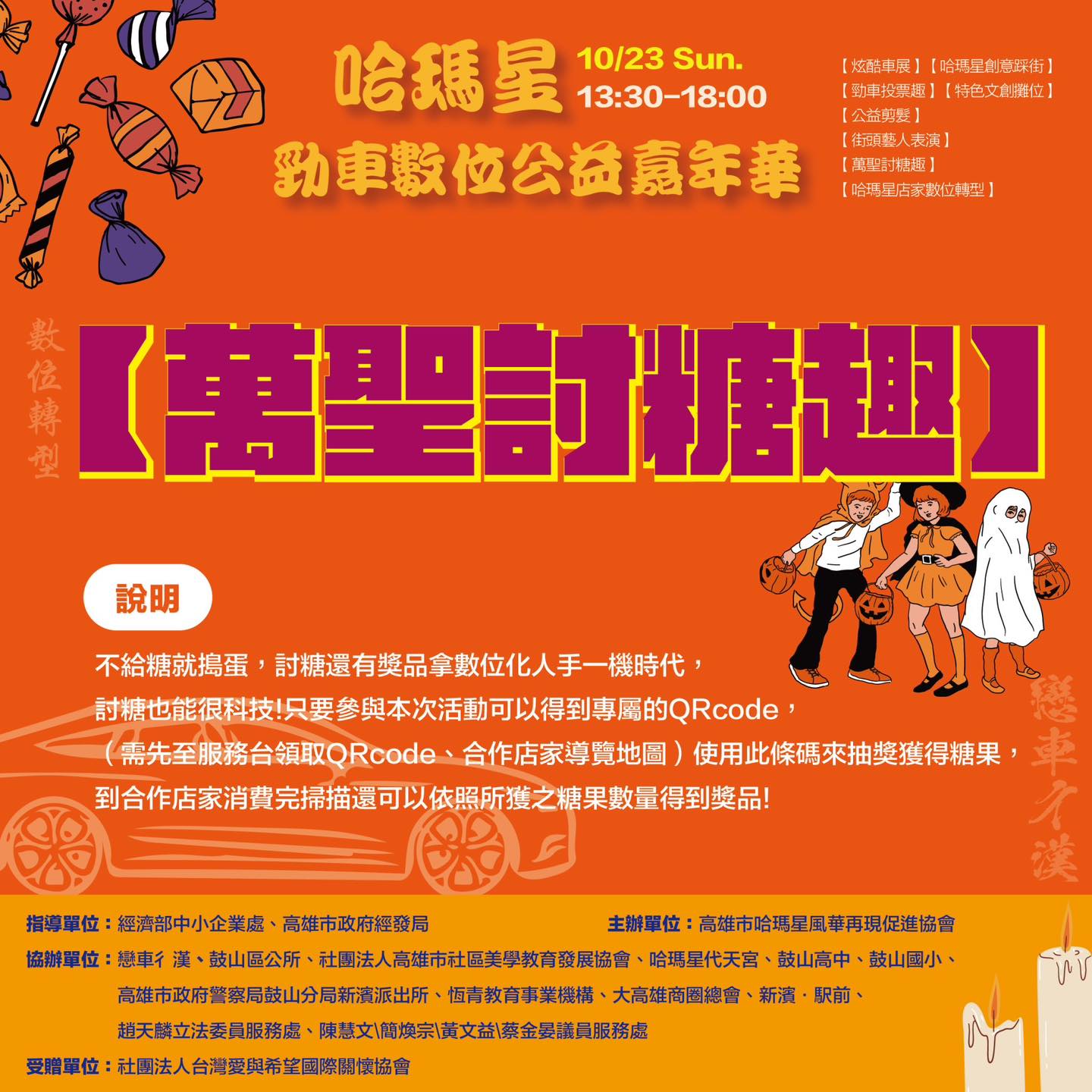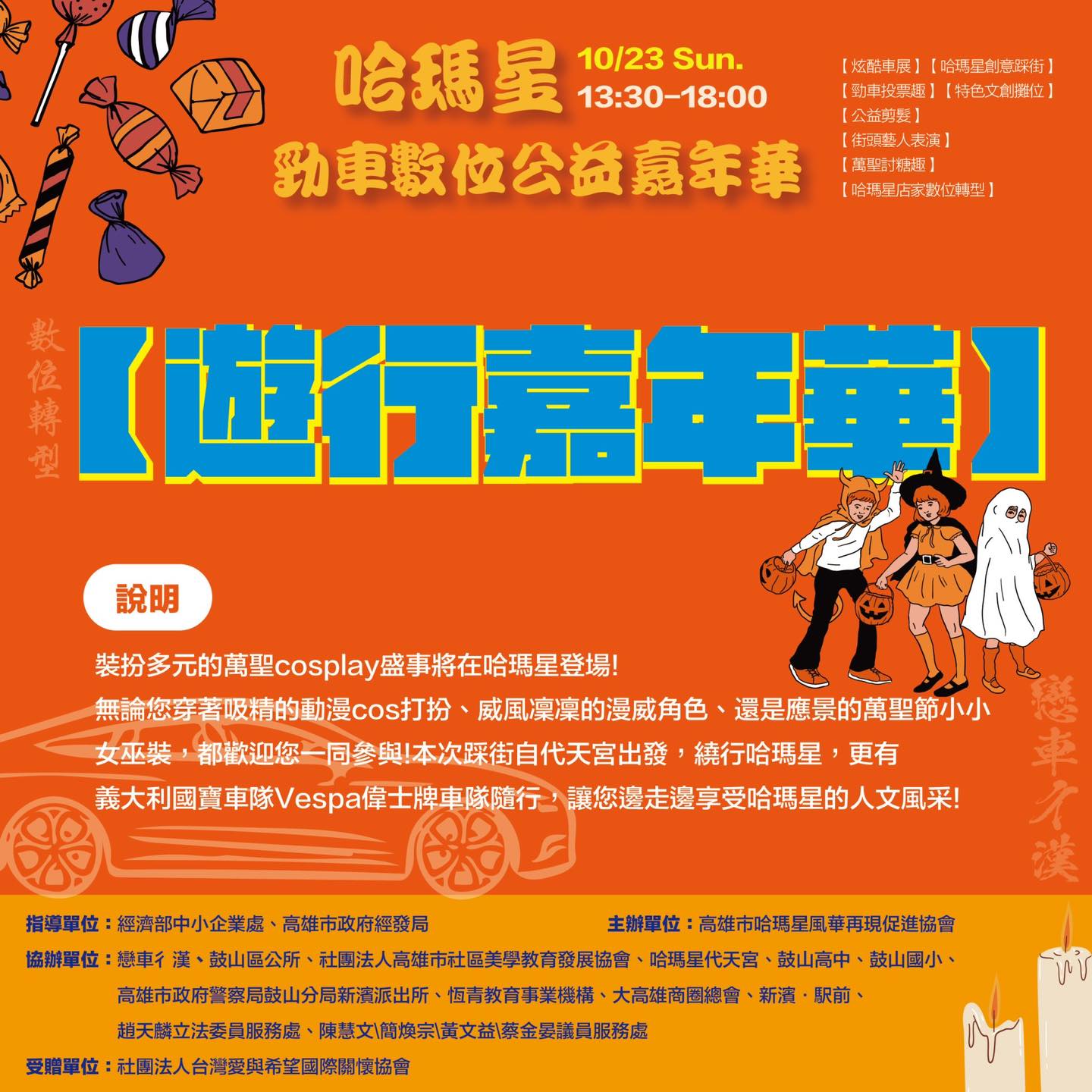 這場「哈瑪星勁車數位公益嘉年華」預計10月23日下午13時開跑,由裝扮多元的COSPLAY帶領Vespa偉士牌車隊隨行,從哈瑪星代天宮出發,繞行哈瑪星後至哈瑪星貿易商大樓前臨海三路活動場地,民眾可自由變裝跟隨隊伍遊行。此外商圈也首度推出數位萬聖討糖趣活動,根據所獲數位糖果數量兌換獎品,活動部分款項將捐贈給社團法人台灣愛與希望國際關懷協會,詳情參閱哈瑪星商圈臉書粉絲專頁(https://reurl.cc/gMKmZR)。