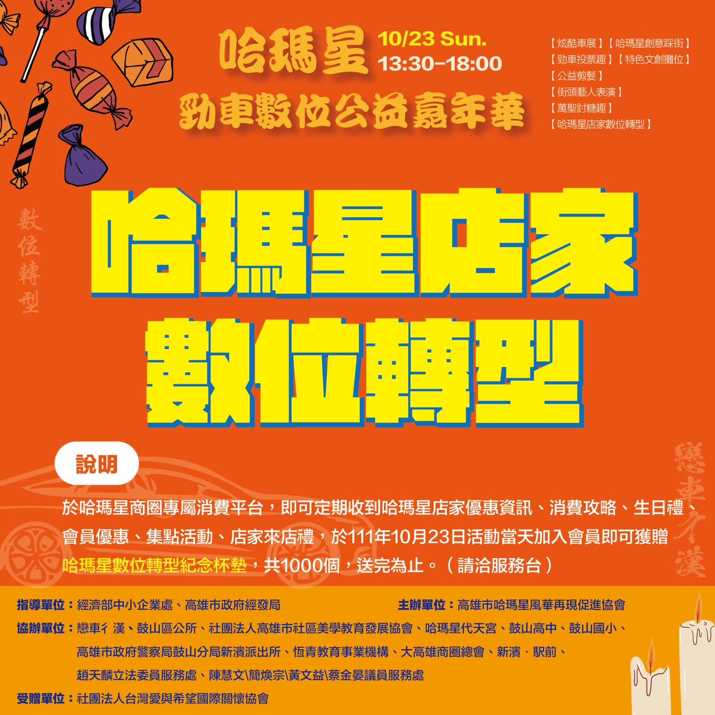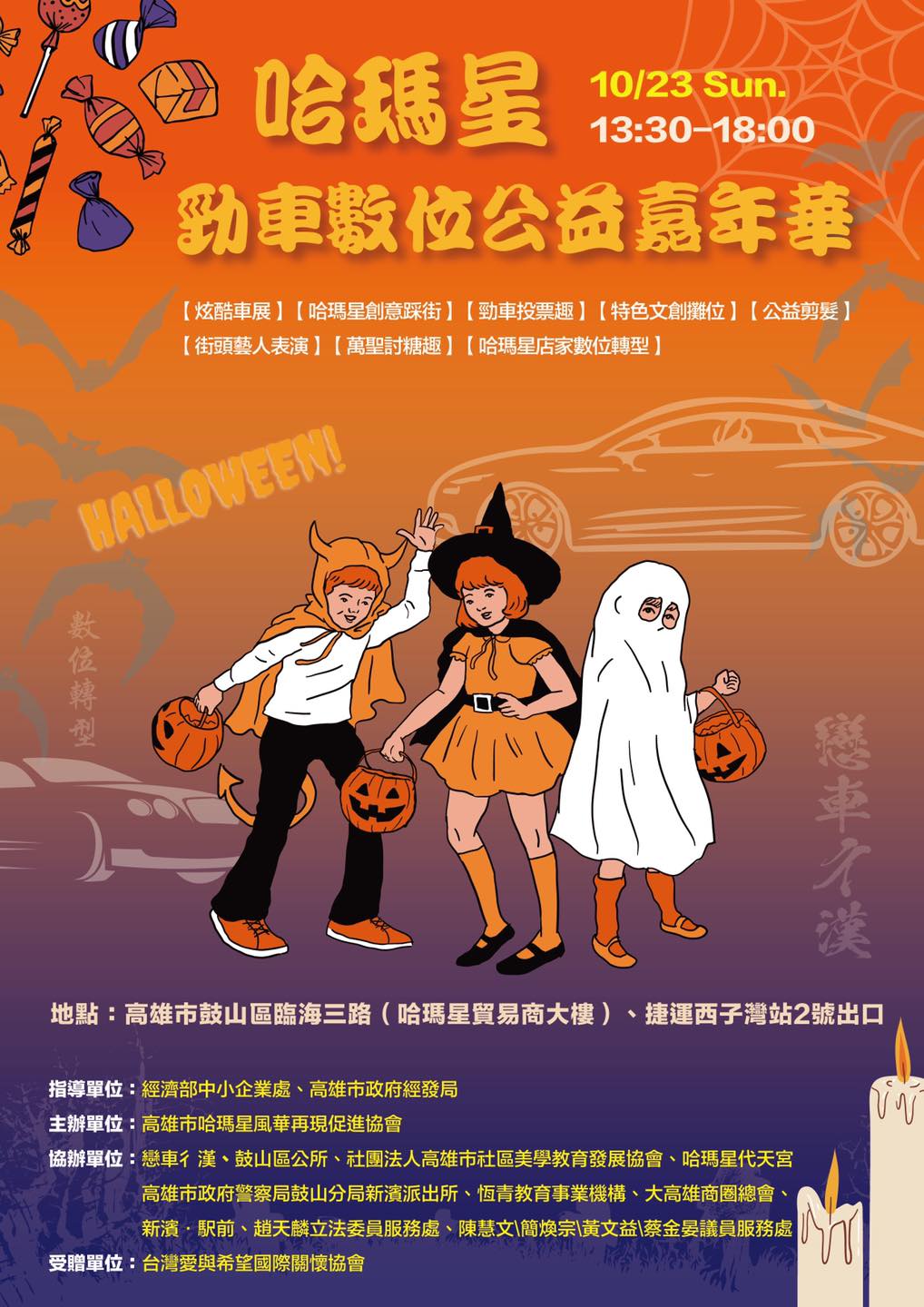 高雄市哈瑪星風華再現促進協會為行銷哈瑪星商圈數位轉型成果,預計10月23日與在地特色汽車團體「戀車ㄔ漢」合作,在臨海三路封街舉辦「哈瑪星勁車數位公益嘉年華」,現場除了有40輛經典名車、古董及改裝車展示,還有精采歌舞表演、萬聖踩街遊行、趣味討糖等活動,加上多元商品特色攤位展售,歡迎民眾踴躍參與。
