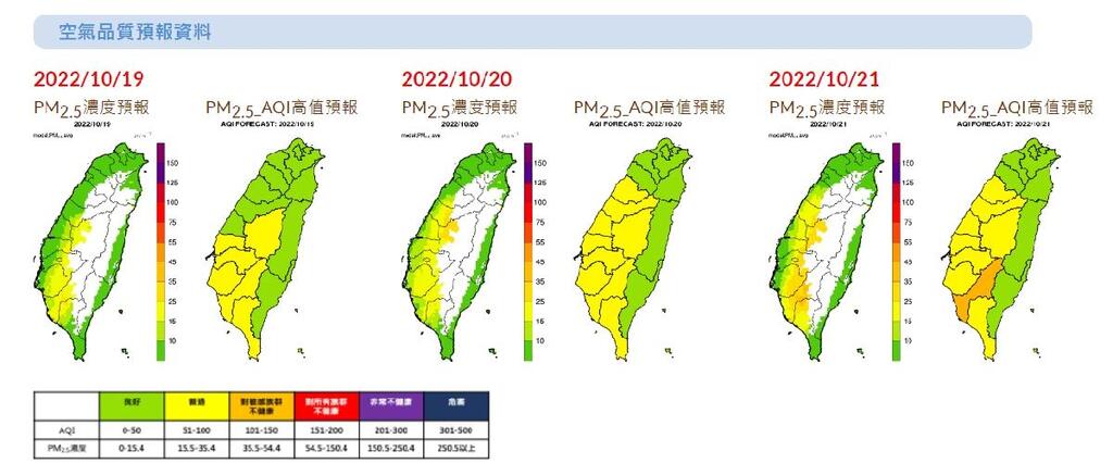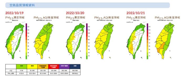 環保局表示,依中央研究院環境變遷研究中心的預報資料顯示,明、後兩日中部細懸浮微粒(PM2.5)AQI高值預報為「普通」等級,環保署及中央氣象局預報顯示,明、後兩日白天東北季風開始減弱,氣溫會緩慢回升,中部地區天氣型態為多雲到晴,中部以南空品區位於下風處,污染物稍易累積,午後受光化作用影響,臭氧濃度稍易上升。