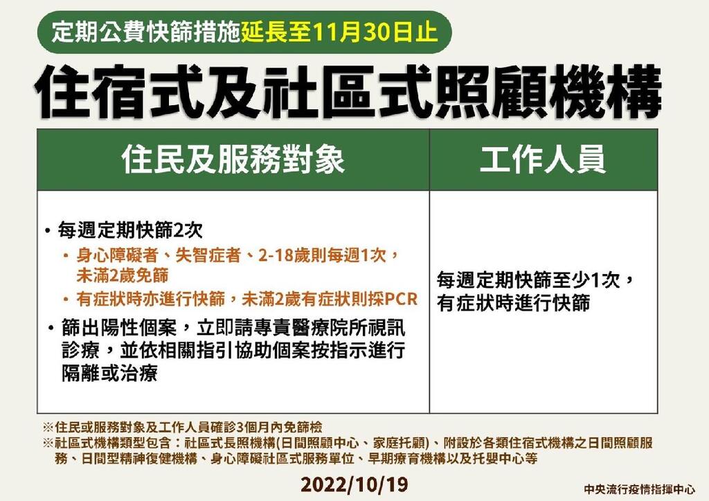 【衛生局】住宿式及社區式照顧機構,定期公費快篩措施延長至11月30日止