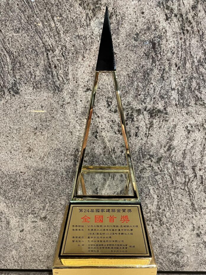 中華民國國家企業競爭力發展協會昨(19)日舉行第24屆國家建築金質獎頒獎典禮,台中市政府水利局獲2項大獎,分別為「旱溝排水水環境改善計畫中部科學(后里)園區綠10-2溪畔景觀池工程」(水利工程組-區域排水工程)-金質獎全國首獎及「台中市大里區污水下水道系統主次幹管及揚水站工程(3)-揚水站」(設施工程組-下水道工程)-金質獎,這是水利局繼9月份2項工程獲第30屆中華建築金石獎後,不到一個月再獲獎項肯定,水利局工程優良品質受認可。