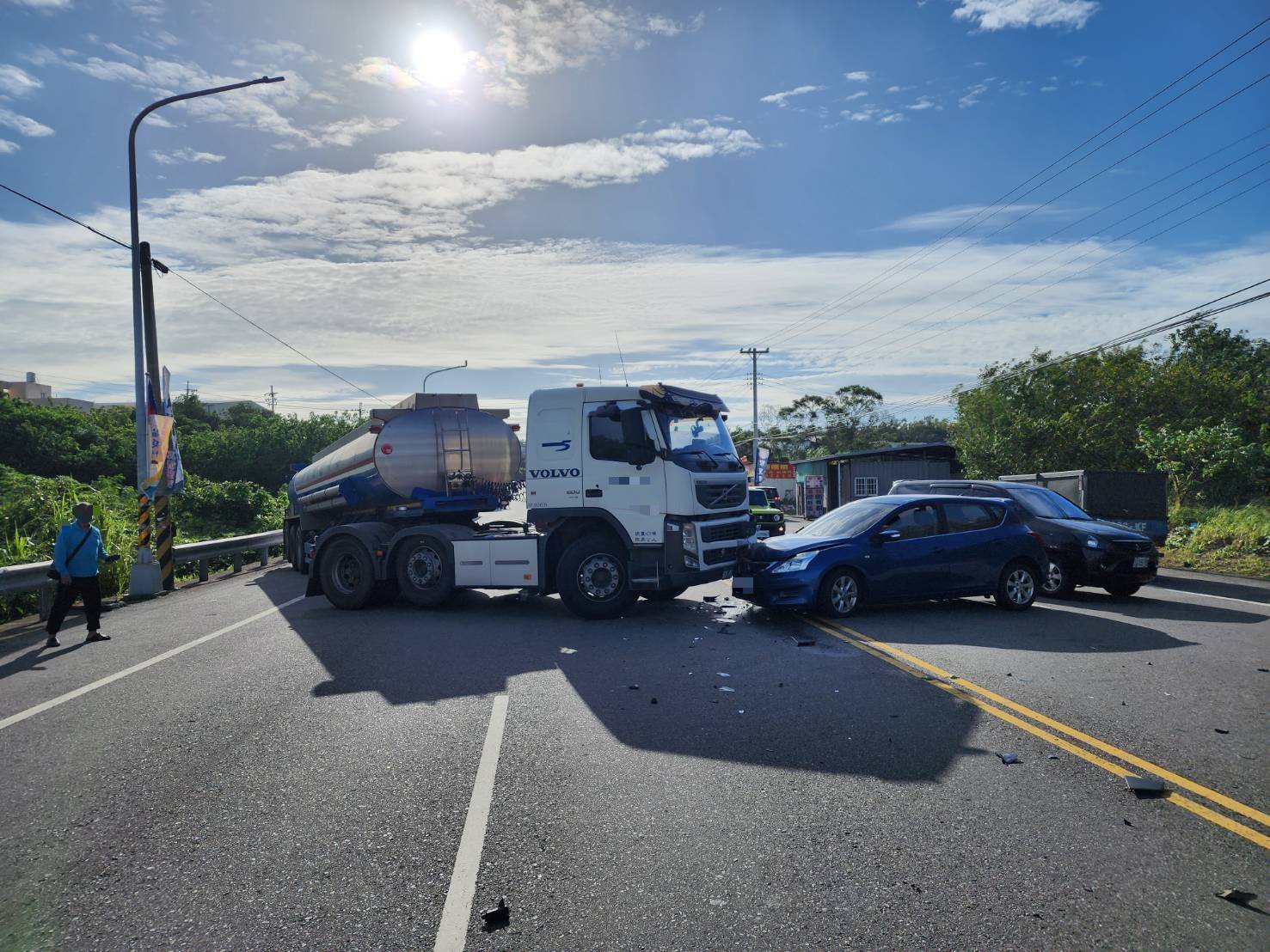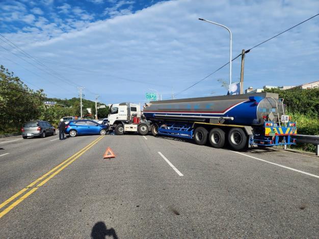 經了解,該路段為雙向4車道,油罐車原本停放在由東往西車道外路邊,疑似於起步行駛至內側車道欲進行迴轉時,與後方同向車道之自小客車發生擦撞,自小客車因而滑行至對向內側車道,雙方車輛車頭均有毀損情形,該處僅剩西往東外側車道可供通行,當時正值上班時間,車流量極大,員警們趕緊協助交通疏導,並請拖吊車將毀壞的車輛拖離現場,於1個小時後,順利恢復交通順暢。雙方無酒駕情事,詳細肇事原因仍待調查釐清。