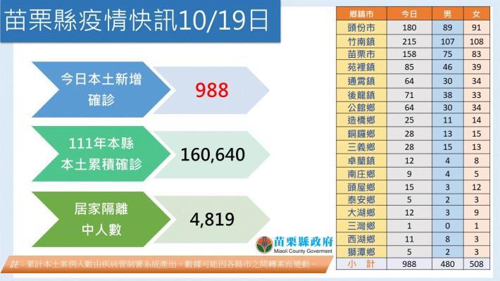 苗栗縣今(10月19日)新增新冠肺炎本土確診988例,其中男性480人、女性508人,年齡分布1歲以下至95歲,現居家隔離人數達4,819人,分析內容如附圖。自今年1月1日至今天0點,累積本土案例16萬640人,人口占比確診率達30.02%。疫情多變,防疫不鬆懈。