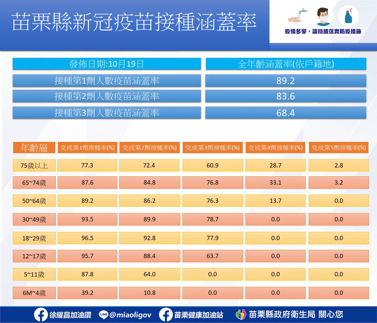 國內新冠肺炎疫情呈現微降溫趨勢,但Omicron新變種變異株BF.7、BQ.1.1及XBB前來叩關。天氣轉涼加上邊境開放,正是病毒活躍季節。張蕊仙局長呼籲長者尤其具慢性病、高齡者、幼兒盡快接種新冠、流感及肺炎鏈球菌疫苗,提升自我保護力。截至目前,苗栗縣莫德納次世代疫苗累計至昨天共1萬5,067人接種。65歲以上第四劑接種率30.9%(全國平均35.7%);6個月至4歲幼兒疫苗接種率第一劑為39.2%(全國平均41.9%)、第二劑為10.8%(全國平均13.5%)為本縣施打率低於全國平均的2個族群。為配合陪同家人時間,方便高齡者及幼兒接種,18鄉鎮市衛生所於10月22日至10月31日間,特加開夜間或假日雙價疫苗及幼兒莫德納、BNT新冠疫苗專診(如附圖)服務鄉親,請多加利用,亦可至53家合約醫療院所完成接種。凡於本縣設籍、工作、就學的65歲以上長者及6個月至4歲者,於10月31日前施打任何1劑新冠疫苗可獲得100元超商禮劵。
