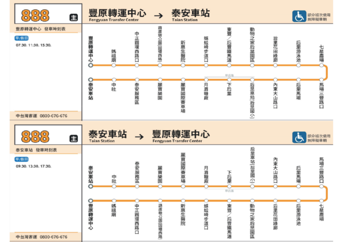交通局說明,888路公車由中台灣客運營運,採固定時刻發車,營運服務時間豐原轉運中心端7時30分至15時30分,泰安車站端9時30分至17時30分,該路線10月23日起將上路,相關乘車資訊可到「台中市政府交通局」官網( http://www.traffic.taichung.gov.tw )、「台中市即時公車動態資訊」網站( http://citybus.taichung.gov.tw/ebus )查詢,或到交通局官網( https://is.gd/MTPvdg )下載台中公車APP,如有問題可撥免費專線「1999」,歡迎民眾多加利用。(10/21*10)*交通局