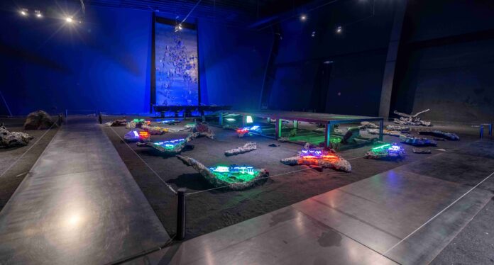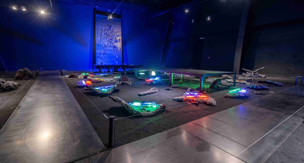 為營造出跨越千年的考古發掘與煉鐵工作現場感,劉柏村特地在展場地面鋪上大量「金鋼砂」,呼應史前人自海灘取得煉鐵資源的概念,與過去一系列以「金剛」命名的展品。整體空間呈現暗黑、多層次、具有神秘感的氛圍,搭配幾組重量級巨型展件,包括結合繽紛多彩霓虹燈的「鋼鐵之上」,運用動力機械的「隕石群」以及由成百上千個「小金剛」堆疊成的山林。讓人一踏進展場,感覺就像是走入了史前、當代與未來文明交織而成的奇幻宇宙。
