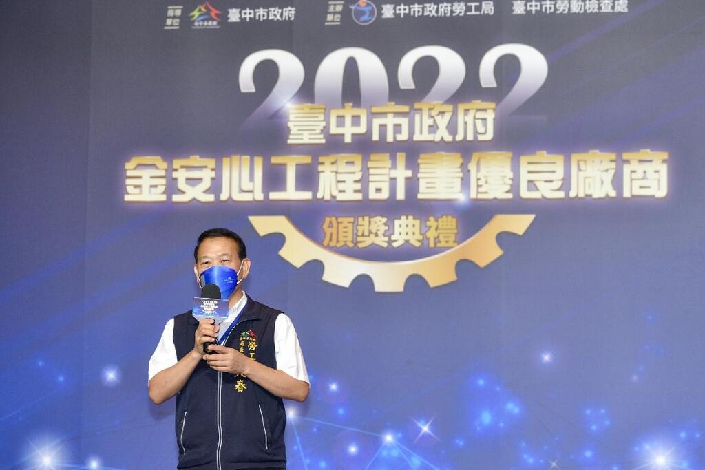台中市政府昨(21)日在台中裕元花園酒店4樓溫莎廣場舉行「2022台中市政府金安心工程計畫優良廠商頒獎典禮」,勞工局長張大春昨出席頒獎表揚,張局長表示,盼透過實質獎勵措施,鼓勵事業單位投入防災資源,改善施工安全文化,為勞工打造安全衛生的工作環境。
