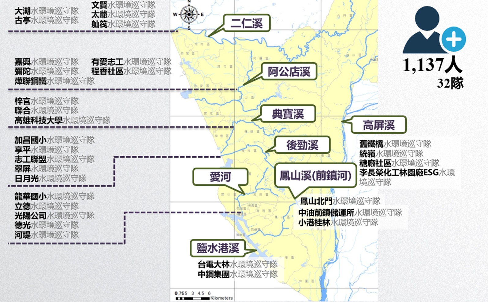 維護河川水域品質需要投入大量人力,身為海洋首都的高雄市於愛河、阿公店溪等八大流域,皆有水環境巡守隊所認養之區域,迄今共成立了32隊水環境巡守隊,分成特色組、學校組、企業組、巡守組等四大類別,每隊皆發展獨樹一格的在地特色,其中「中鋼集團水環境巡守隊」是全國首支企業型水環境巡守隊,自民國94年成立迄今,落實企業社會責任,持續不斷堅守巡守崗位,保護鹽水港溪;而社區巡守組─鳳山北門水環境巡守隊榮獲行政院環境保護署「110年度優良水環境巡守隊」甲等獎。