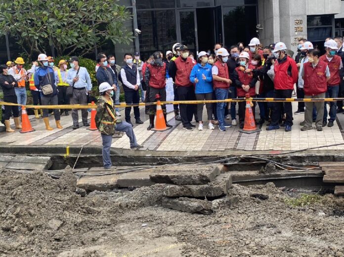 侯市長本(23)日,視察汐止工建路了解事故原因及修繕工法外,指示水利局全力搶修路面並請交通局及警察局,妥善疏導車流,以維持市民的安全與通行便利,另亦對冒雨搶修的施工人員表達謝意。