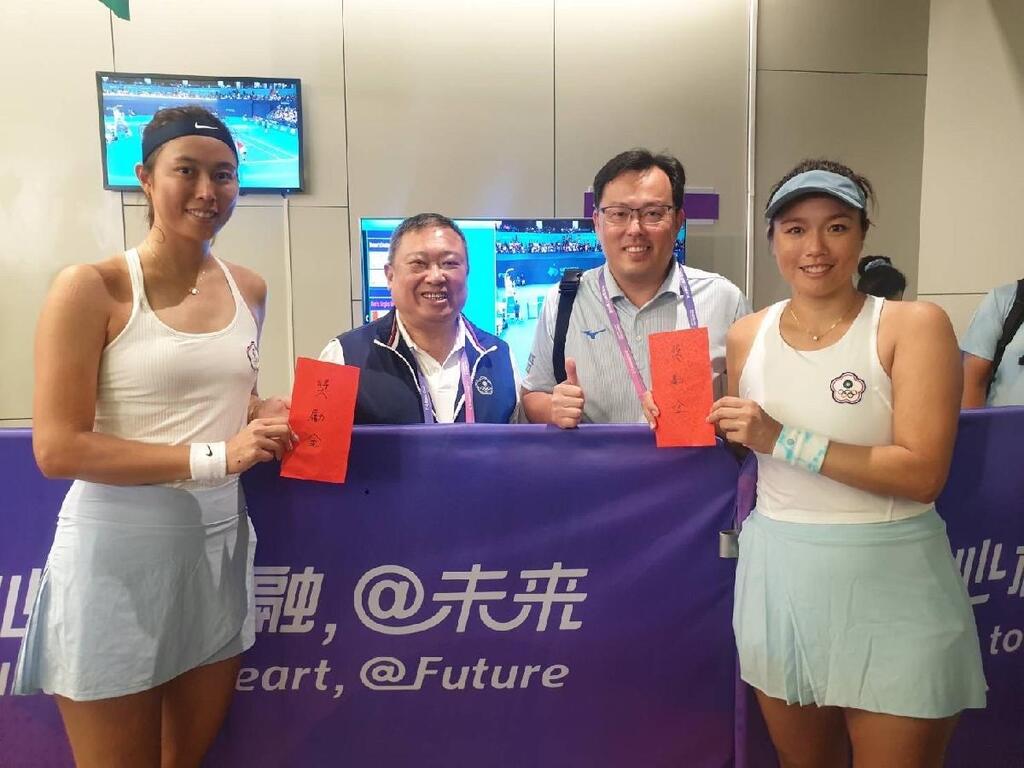 今(30)日在「第19屆杭州亞洲運動會」網球女雙項目上演臺灣內戰,賽前即確定我國代表團金包銀,由李亞軒/梁恩碩出戰詹詠然/詹皓晴,體育署鄭世忠署長及代表團林鴻道團長都在現場觀賽。最後由「詹家姐妹」摘下金牌,李梁配收穫銀牌,蔡英文總統得知捷報,旋即拍發賀電祝賀選手的優異表現。