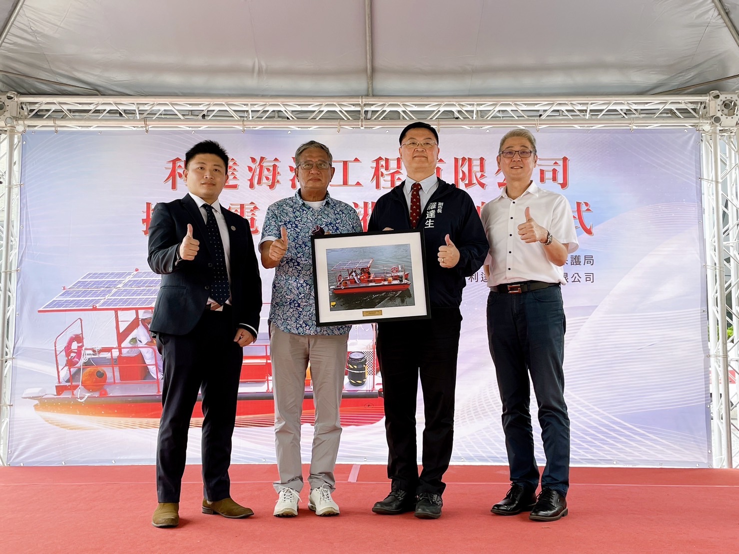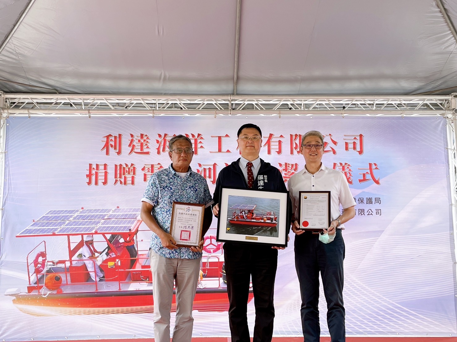 今(24)日下午高市府環保局辦理太陽能電動清潔船受贈儀式,感謝利達海洋工程有限公司全新打造「利達辰光號」,加入愛河河面清理行列。副市長羅達生特頒贈感謝狀,對於利達公司楊啟雄董事長以行動展現企業社會責任,響應高雄綠色城市淨零生活表達感謝之意。