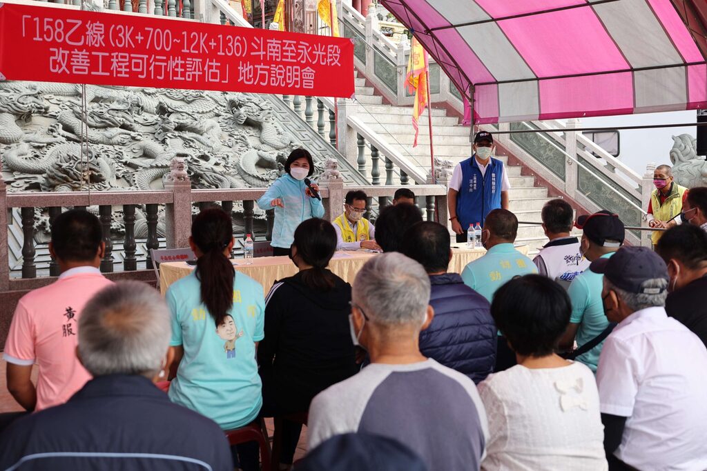 為辦理縣道158乙線道路拓寬,縣府於110年1月向交通部公路總局爭取計畫經費,辦理可行性研究並規劃可行方案,現階段已完成相關規劃,縣長張麗善率工務團隊於今(10/25)日上午邀請蔡東富議員、斗南鎮沈暉勛鎮長、地方代表及鄉親等,於斗南鎮阿丹里進興宮前,辦理規劃成果說明,並聽取地方建議。