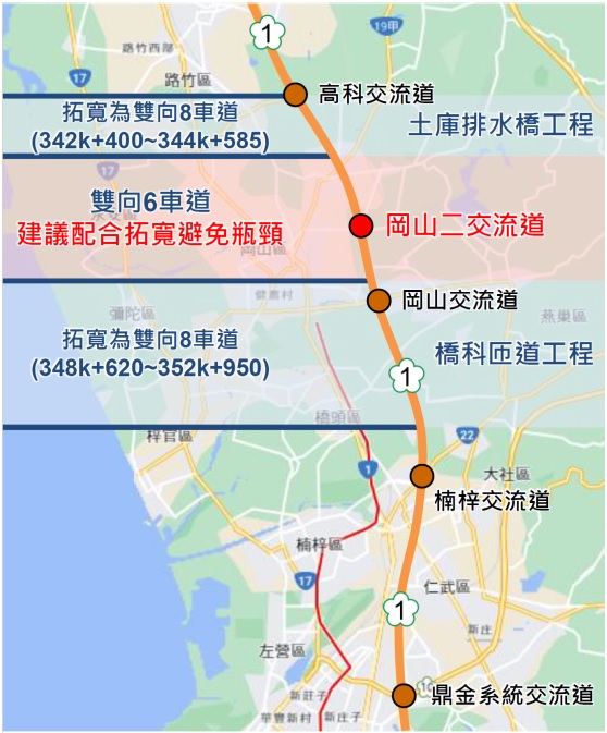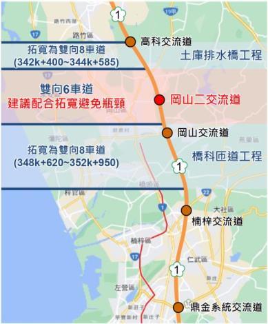 為有效解決目前國道一號岡山交流道及周邊壅塞車流,並因應未來橋頭科學園區及岡山地區日益增加的車潮,高市府積極爭取增設岡山第二交流道,今(24日)終獲得國家發展委員會審議通過,建設計畫總工程經費43.8億元,預計民國117年前完工通車。