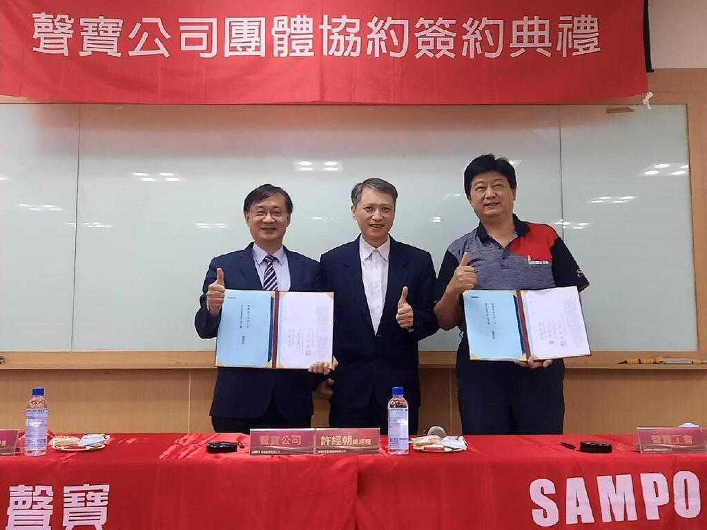 國內知名家電品牌SAMPO聲寶公司,今(25)日與工會舉行團體協約簽約儀式。在新北市勞工局長陳瑞嘉共同見證下,聲寶總經理許經朝、工會理事長吳國源代表雙方簽字,這份團協將適用於工會會員,除了延續協約原有勞動條件與福利,本次還新增「員工公益假」、「人事獎懲評議委員會邀請工會代表為委員」等,持續展現企業照顧員工之社會責任,並讓外界看見勞資雙方良好互動。