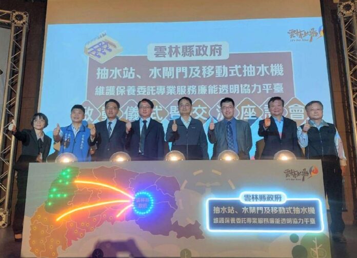 三!二!一! 咚咚咚,雲林縣政府於今(25)日由莿桐鄉育仁國小戰鼓隊的鼓聲以及秘書長曾元煌率領水利處處及政風處等團隊,邀請臺灣雲林地方檢署檢察長張春暉、雲林縣調查站張序立主任、台灣透明組織協會方凱弘監事等產、官、學界代表,共同點亮本縣所設置抽水站及水閘門站體,同時成立雲林政府抽水站、水閘門及移動式抽水機維護保養委託專業服務廉能透明協力平臺,現場邀集廠商、機關同仁計約100多人參與,共同外界宣示雲林縣政府廉能透明的決心。