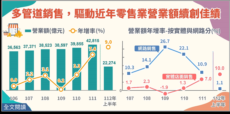 2.疫情催化,實體店面與網路銷售走勢分歧:若以銷售管道區分,零售業多以經營實體店面為主,實體店面營業額占整體零售業營業額達8成5以上,然在疫情期間,因管制措施減少實體面對面接觸時間,致109~111年僅平均成長2.0%,低於整體(3.6%);同期間,網路銷售受惠實施隔離措施及電商滲透率提升下,110年營收規模突破4千億元,111年為4,930億元,109~111年平均成長19.7%,優於整體零售業(3.6%),且大幅領先實體店面(2.0%)。隨今年上半年全面解封,人潮湧入,加上低基期因素,實體店面營業額年增率大幅提升至10.0%,為有統計數據以來最大增幅,網路銷售則在高基期下,增幅明顯趨緩至1.1%。