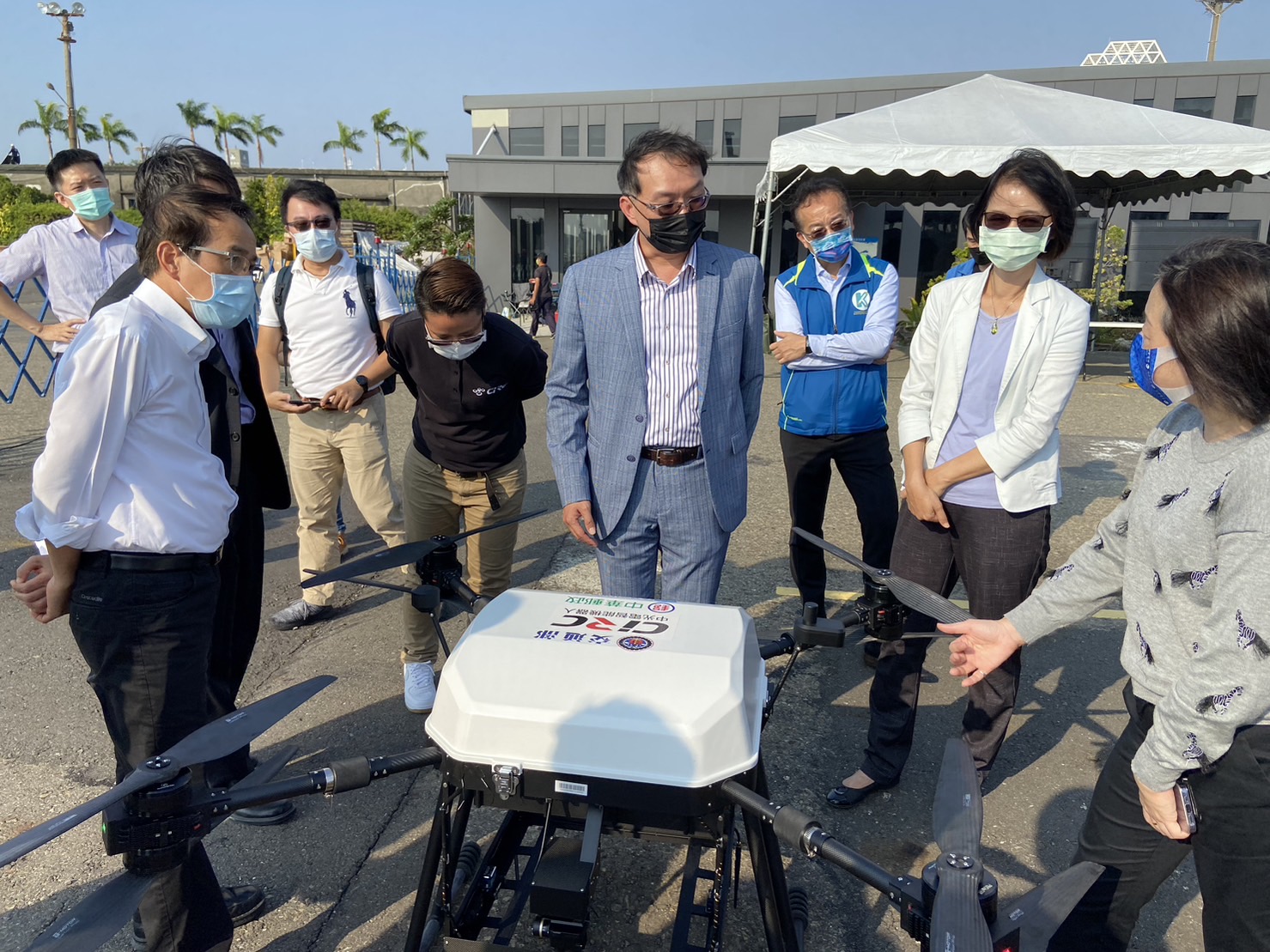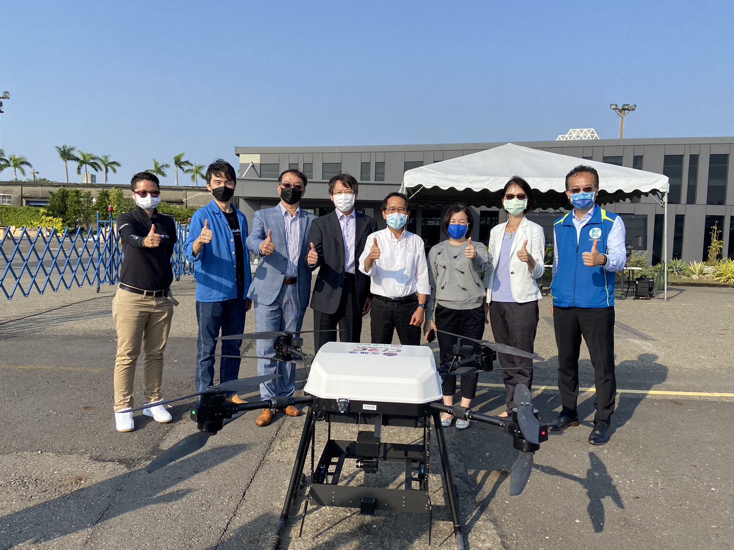 市府副市長林欽榮、交通局長張淑娟、數位部數位產業署主秘黃雅萍、臺灣港務公司副總經理蘇建榮及高市府資訊中心、KPMO等28日於高雄港共同見證無人機載貨物流運送服務。