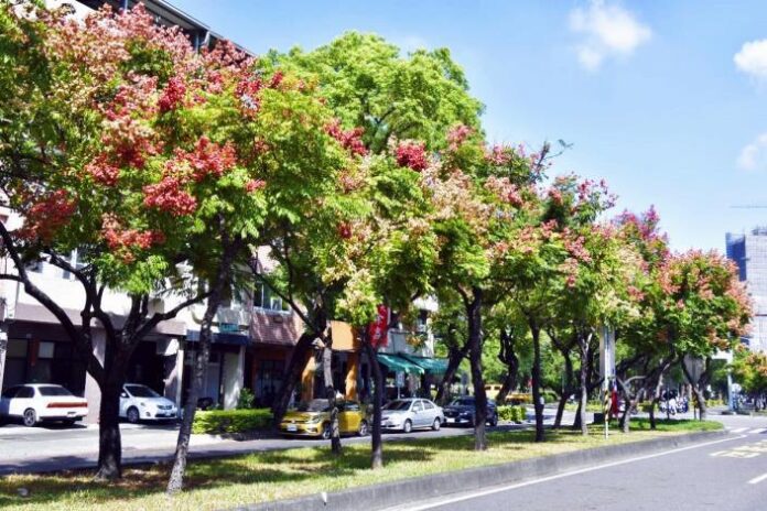 養工處說明,入秋後的台灣欒樹與民生路的綠廊水岸相互輝映,冠滿枝頭的蒴果編織成欒樹的小紅帽,為行經民生路的人們增添了幾分趣味;季節的畫筆則恣意揮灑色彩,點綴在民權路的欒樹上,將民權路妝點成繽紛的四色大道;興楠路上飽滿的台灣欒樹正熱情地迎接往來的民眾,此外,鮮明的欒樹也點亮了綠叢迷宮中的橋新五路。