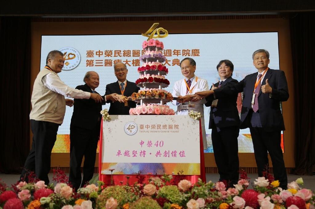 今日典禮,由總統府秘書長李大維頒獎表揚獲得「特殊貢獻獎」的9位資深員工,感謝他們終生付出與卓越貢獻。隨後與立法院副院長蔡其昌、衛福部政務次長王必勝、國軍退除役官兵輔導會副主任委員吳志揚、市府衛生局長曾梓展與台中榮民總醫院長陳適安,一起切下6層大蛋糕,祝福台中榮民總醫院40歲「生日快樂」、「立足台灣、引領世界」。