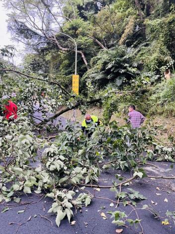 苗栗縣警察局頭份分局南庄分駐所於111年10月31日6時20分許,接獲民眾報案稱:124線27公里處有路樹倒塌的情形,請求警方協助,巡佐朱達文立即率警員黃俊尉前往處理,到達現場後發現該路樹遭強風吹倒橫躺路中間,影響交通安全,除下車放置交通錐提醒行經該路段之人車,注意行車安全,另通知南庄鄉公所派員前往排除,經與東村村長、南庄鄉公所、南庄消防隊共同合作下,於半小時後順利清理完畢,恢復人車通行。