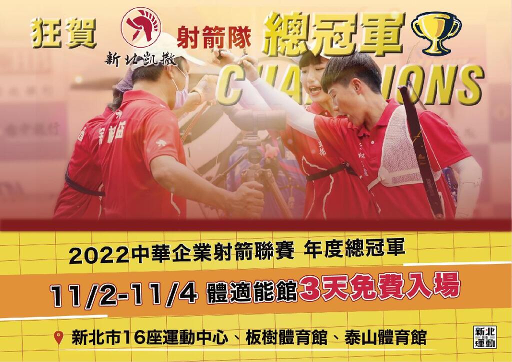 2022中華企業射箭聯賽第4年,日前在國立體育大學由「新北凱撒射箭隊」拿下年度總冠軍!總冠軍賽採5戰3勝制,前2戰新北凱撒強壓寒舍集團射箭隊,拿下2連勝,再以3勝不敗之姿登頂2022中華企業射箭聯賽寶座。市府邀全民一起同賀!將於11月2、3、4日連續3天,開放新北市運動中心、板樹體育館及泰山體育館等18個運動聚點,體適能館3天免費入場,歡慶新北凱撒射箭隊拿下隊史首冠!