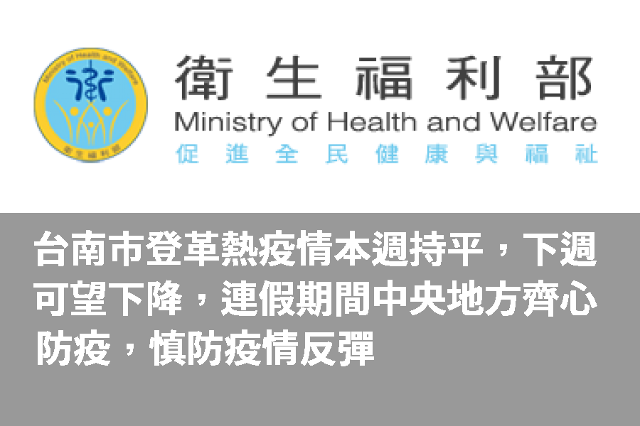 衛生福利台南市登革熱疫情本週持平,下週可望下降,連假期間中央地方齊心防疫,慎防疫情反彈