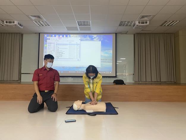 宣導人員向與會人員宣導急救知識與技能,熟悉「叫、叫、壓、電」四步驟,亦給予民眾上台實際操作「心肺復甦術(CPR)」及「自動體外心臟電擊去顫器(AED)」。自衛消防編組部分則先詳細解說自衛消防各編組(共有指揮班、滅火班、通報班、避難引導班、安全防護班)工作內容,讓員工知悉在面對災害時的各分組應採取的災害應變措施。而當火災發生時,須依自衛消防編組進行初期火災狀況處理及緊急疏散,並指導火場逃生要領與求生技巧,最後則加上滅火器、室內消防栓消防安全設備的使用方式與注意事項。