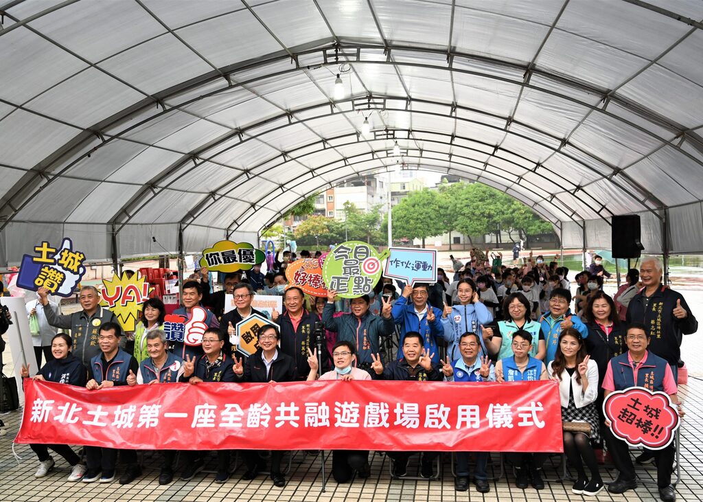新北土城第一座全齡共融遊戲場(新北市土城區裕民路193-1號),就在新北市土城區綜合體育場內,今(1)日由土城區長陳國欽邀請立委、議員、里長及大朋友、小朋友共同參加啟用儀式一同慶祝。土城綜合體育場自民國88年首次啟用後,改造使用超過20年的遊戲場,融入全齡共融特色,汰換年久不符效益的罐頭遊具及體健設施,工程經費總共1,500萬,分別設置冒險樂園遊戲區、共融親子互動區及榕樹樂齡體健區。並搭配體育場既有的田徑場、直排輪場、寵物公園、風雨籃球場及自然步道,提供市民更多元豐富的休憩空間。