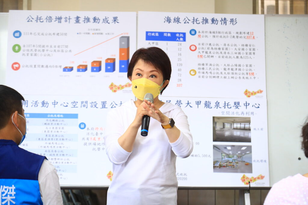 「因為重視,所以每間公托她都親自視察!」盧市長表示,原本台中市29區只有5間公托,她上任3年多來,台中公托數量已增加至27間,邁向6倍增;大甲龍泉公托位在龍泉社區長壽會館2樓,經市府耐震補強建築物後重新營運,今日視察營運狀況良好,感謝大甲區公所和龍泉社區發展協會提供優質的環境,公托緊鄰市立大甲幼兒園,完整龍泉里的幼托拼圖。