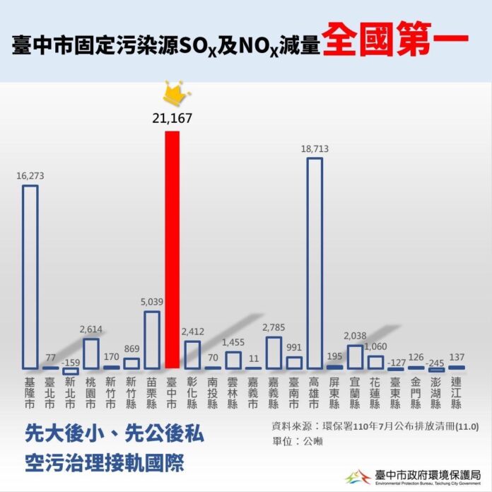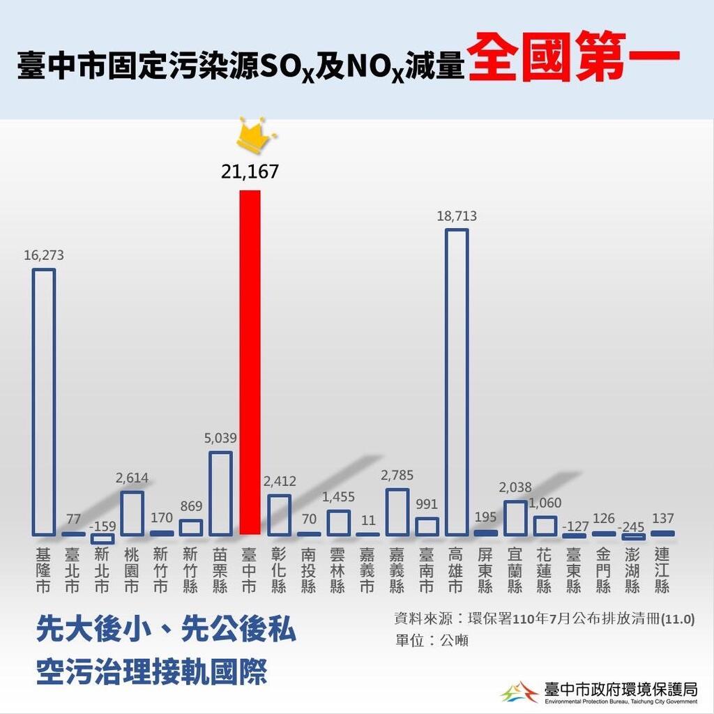 根據行政院環保署去年7月公布最新一期的空氣污染排放清冊TEDS 11.0版本,台中是全國硫氧化物和氮氧化物唯一減量超過2萬公噸的縣市,對全台的空品改善貢獻度最高。台中市政府環保局長陳宏益表示,今年至10月底台中空品不良日數(AQI大於100)11天,創下歷年同期不良日最少紀錄;能見度佳(代表大於15公里)高達152天,空品、能見度都大幅改善。