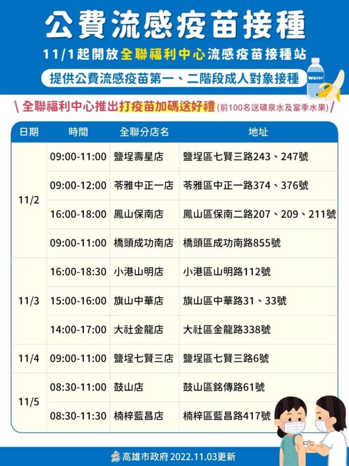 南部新聞高雄市【衛生局】11/3更新全聯福利中心公費流感疫苗接種地點資訊