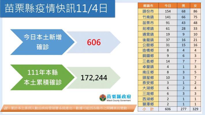 苗栗縣今(11月4日)新增新冠肺炎本土確診606例,其中男性277人、女性329人,年齡分布1歲以下至96歲,分析內容如附圖。自今年1月1日至今天0點,累積本土案例17萬2,244人,人口占比確診率達32.18%。疫情多變,防疫不鬆懈。