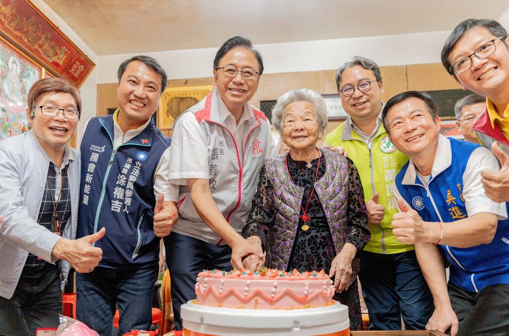 今日張市長特別代表總統府及衛福部致贈陳吳奶奶金鎖片,也代表市府致贈金戒指、獎牌及2萬元重陽禮金;張市長與陳吳阿絨奶奶一同切蛋糕,並一起品嚐陳吳阿絨奶奶平時最喜愛的草莓冰淇淋,眾人為百歲人瑞獻上祝福。