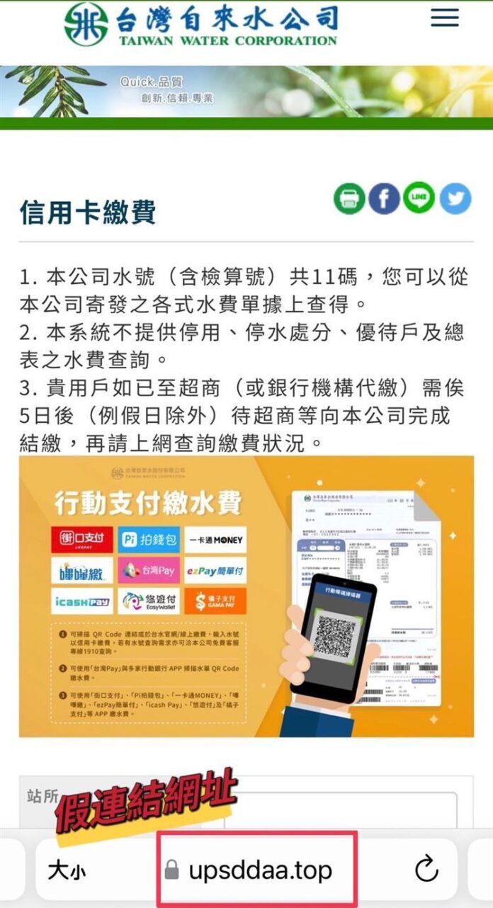 台水總經理李丁來表示,近期不少民眾收到可疑的水費催繳簡訊,點擊連結後會開啟幾可亂真的偽造網站,但仔細一看就可以發現連結網址相當可疑,呼籲民眾不要上當,更強調台水發送催繳簡訊時,不會提供任何連結,亦不會要求用戶線上提供信用卡資料或匯款。