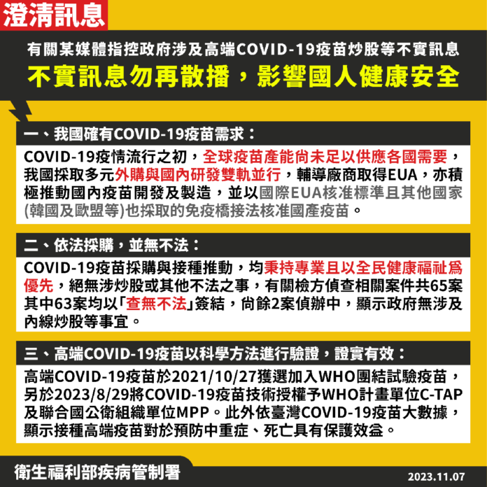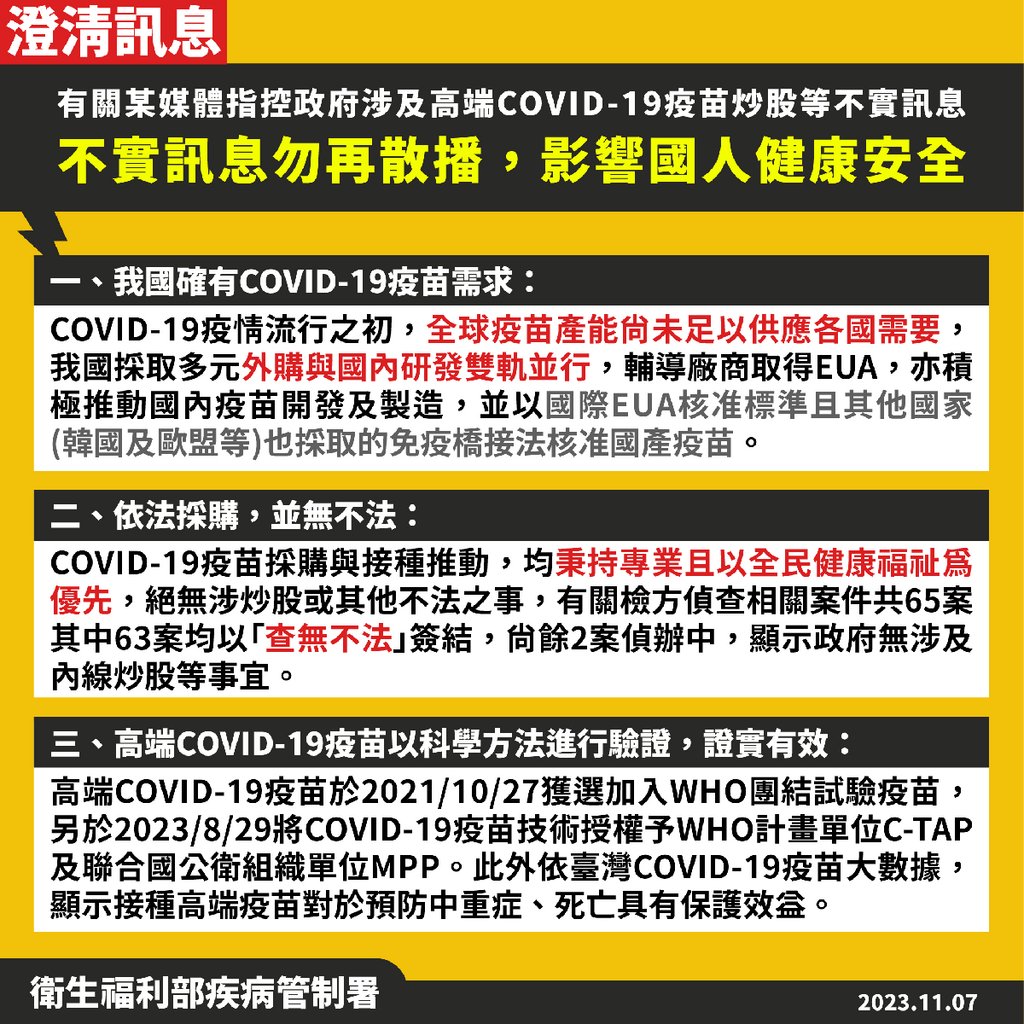 疾病管制署今(7)日表示, 有關今日媒體報導高端疫苗「高端63告發案檢簽結 疑雲未解」、「業界:疫苗、快篩國家隊虛有其名」、「指揮中心成股價炒手」等議題,疾管署嚴正澄清,相關指控均為揣測及道聽塗說,請有心人士勿再扭曲事實、混淆視聽,散播不實訊息,影響國人健康安全。