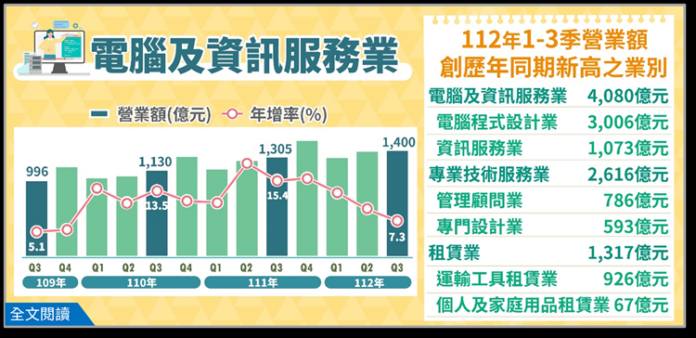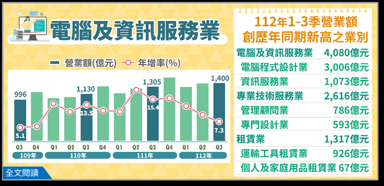 1.112年第3季電腦及資訊服務業營業額1,400億元,為歷年同季新高,年增7.3%,其中電腦程式設計業1,024億元,年增4.1%,主因軟硬體規劃設計、網路儲存伺服器系統建置案增加所致;資訊服務業376億元,年增17.0%,主因網站拍賣平台之管理業者調高服務手續費以及推出多樣化促銷活動,加上代客處理電子資料交換及雲端設備服務需求強勁所致。