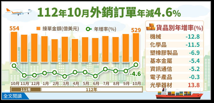 1.與上月比較:10月外銷訂單528.7億美元,較上月增加14.7億美元或增2.9%,經季節調整後增5.7%。