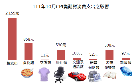 若以每月消費支出約7萬元之家庭為例,就10月CPI年增率3.08%而言,在購買相同品質與數量的商品及服務情況下,平均消費支出會較上年同月增加2,159元;七大類中食物類因穀類及其製品及外食費價格上漲而增加858元,居住類因家庭用品等價格上漲而增加530元,教養娛樂類因國外旅遊團費上漲而增加508元。