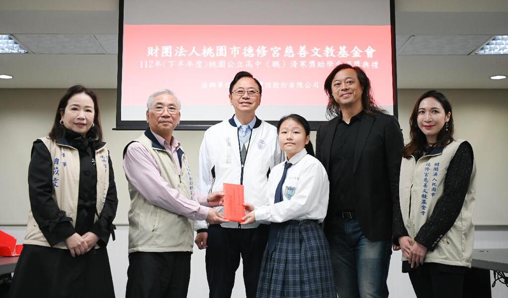 今日包括市府教育局長劉仲成、德修宮慈善文教基金會副執行長廖萬全、董事黃造蓉、楊岱錡、曲苡雯、桃園市各公立高中職校長與代表均一同出席頒獎典禮。