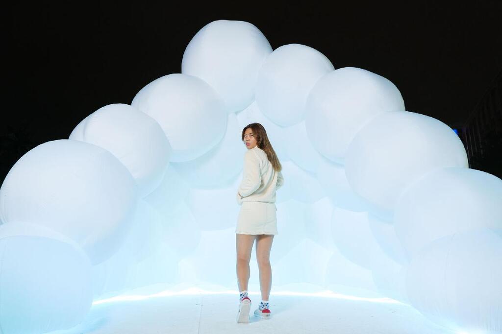 來到「雪國耶誕」裝置前,可以感受到其獨特的科技風格,以北極風光為主題,藉由地面造景與周圍屏幕佈置,搭配燈光藝術的變換,就彷彿被極光圍繞著。閃閃發亮的屏幕會不斷展現多種樣貌,藝術團隊透過整合近十年來包括石碇、福隆、林口、坪林,五個新北市極點區域的大氣觀測資料,利用AI科技讓數字訊號轉化為圖像表徵,讓這些氣候數據形成的曲線衝擊波,模擬出大氣中帶電粒子碰撞所造成的極光景象,展現獨一無二的聲光演出,而這些聲光變化象徵著新北市的氣候數據變化,呈現出新北市多元的面貌。