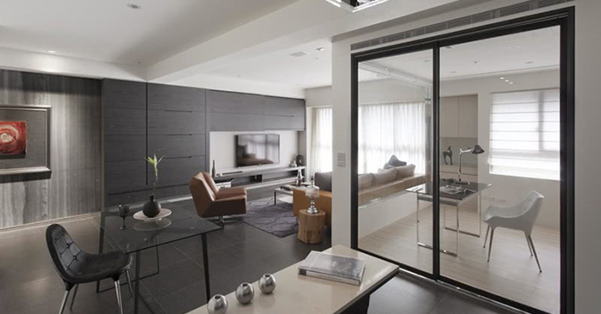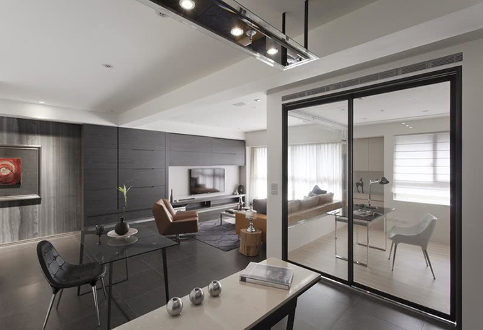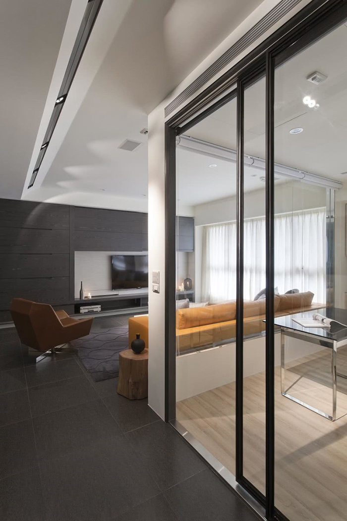 書房區以玻璃環繞,淺色木地板與客廳地磚的材質