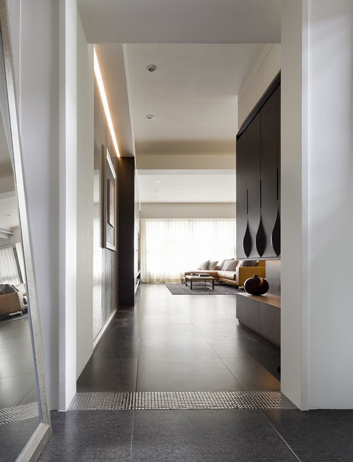 玄關處採用與客廳相同的深灰色大理石。