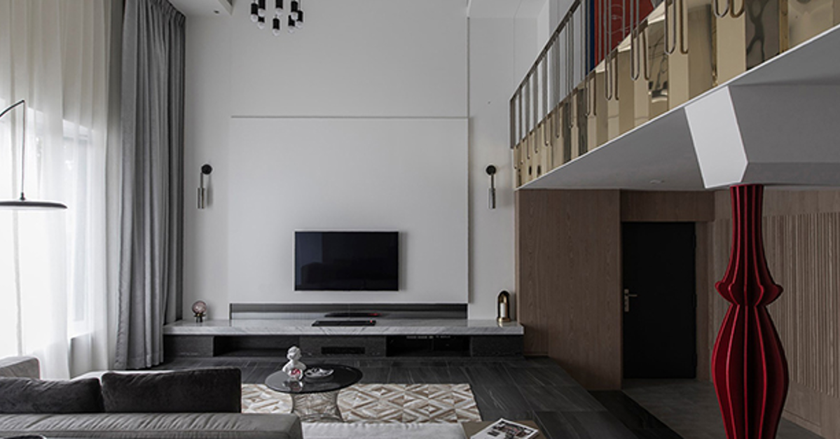 以帕格尼尼狂想曲做藍本,創作獨有的透天挑高公寓,客廳沙發背牆如瀑布般冷冽,配予紅色優雅立柱,如同雅典神廟的女神石柱,優雅跳著迴旋舞。金色琴鍵與琴弦般的扶手,交織這藝術般的空間迴廊。將一樓既有高層踏階改為無障礙坡道,日後如有輪椅代步更增便利性。主臥室規劃成飯店式套房,軟包布料搭配暈染帶入人文氣息。進家門如同走入藝術殿堂,放縱享受空間的美妙旋律,回到家彷彿回到飯店般的舒適高雅。