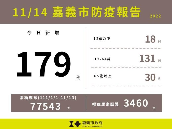 中央流行疫情指揮中心今(11/14)日公布全國本土新增16,578例,嘉義市新增179例確診個案,包含12歲以下18例,12-64歲131例,65歲以上30例。嘉義市目前輕症居家照護人數3460人。111/1/1截至111/11/13嘉義市累計確診嚴重特殊傳染性肺炎本土病例數為77543人。 指揮中心宣布自今(11/14)日起,採居家照護之COVID-19非重症確診者隔離/自主健康管理改為「5+n天」,亦即居家照護確診者隔離滿5天後,若快篩陰性則無需進行自主健康管理;若快篩陽性應持續進行自主健康管理至快篩陰性日,或至距離解除隔離日滿7天。請仍需進行自主健康管理之民眾,期間應避免出入無法保持社交距離或容易近距離接觸不特定對象之場所,禁止聚餐、聚會等近距離或群聚型活動,並遵守現行醫療應變措施,以保護自己與他人。 衛生局呼籲,隨著疫情趨緩,各項防疫措施將逐步鬆綁,回歸常態生活,請民眾配合相關防治措施及指引,持續落實「戴口罩、勤洗手、打疫苗」,以降低疾病傳播風險。相關接種訊息請至衛生局網站/主題專區/COVID-19疫苗接種資訊專區(https://health.chiayi.gov.tw/cp.aspx?n=7501)查詢。